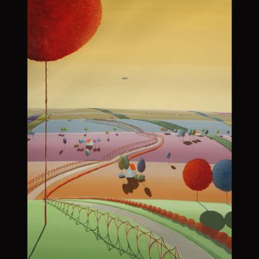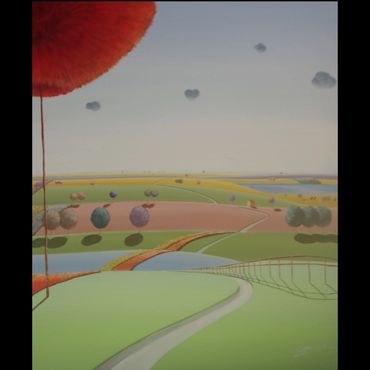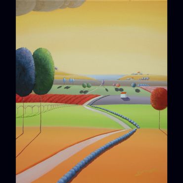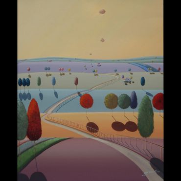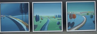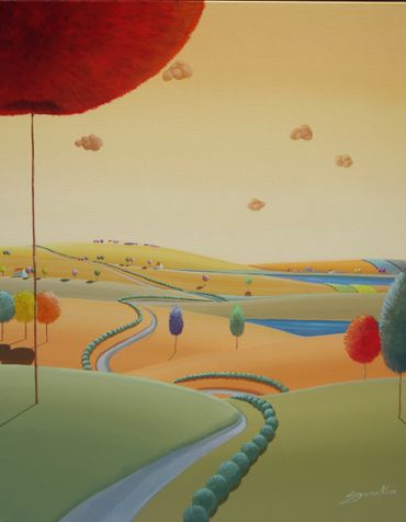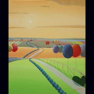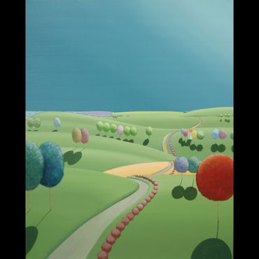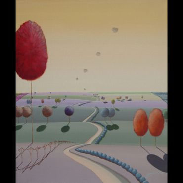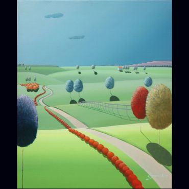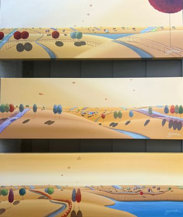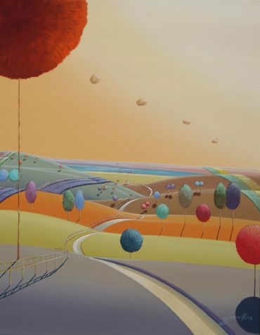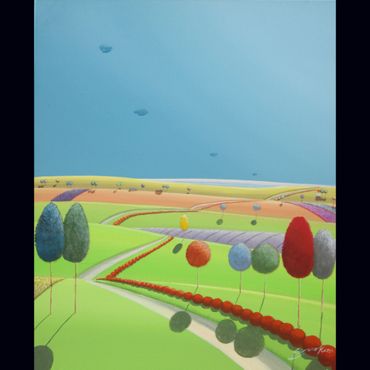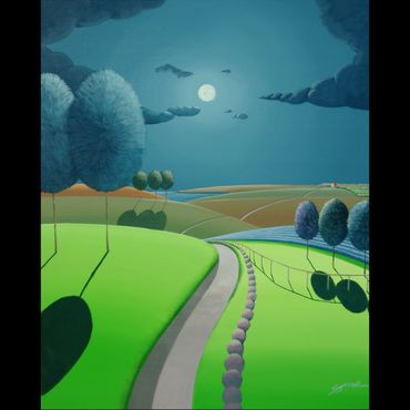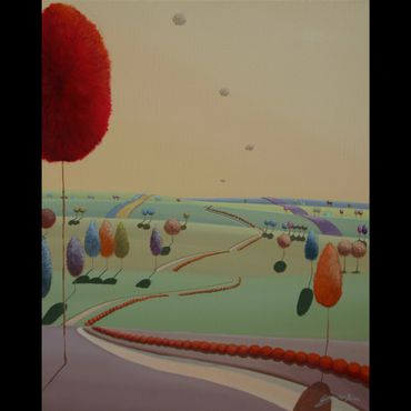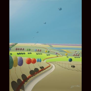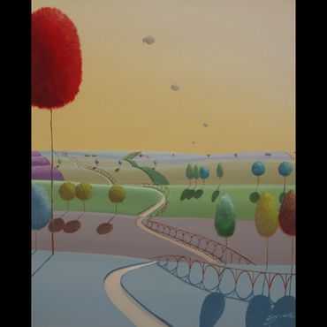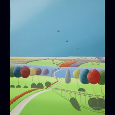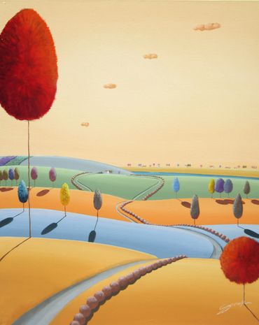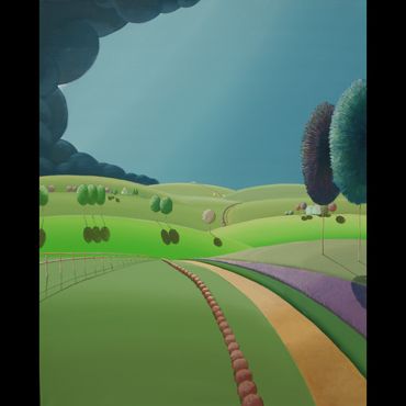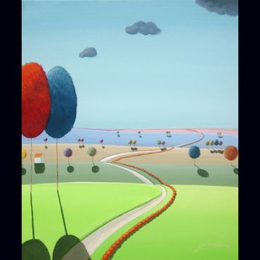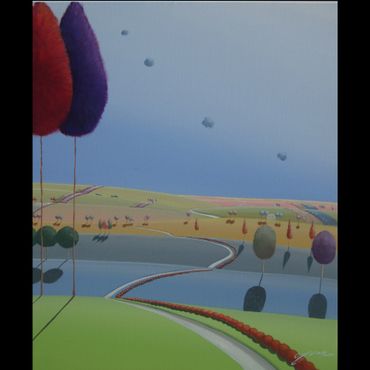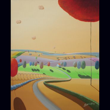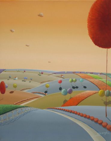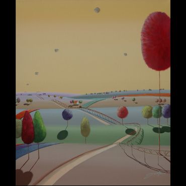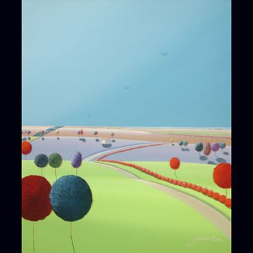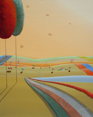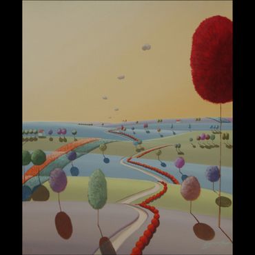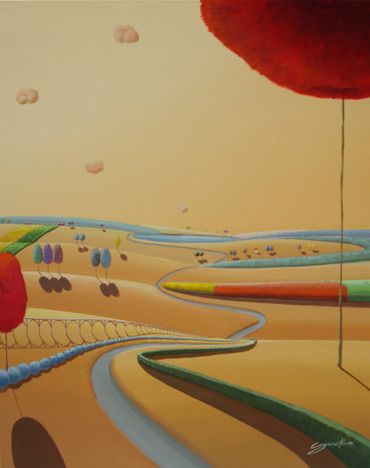 From a line sketch, I focus on the moving lines to emphasize flow. After painting the sky and building up the stories from the background (sub-dominant), I am able to create a visual fantasy world. I choose one dominant color and mix it with others to suggest that there are many layers, stories and themes inside of one painting.